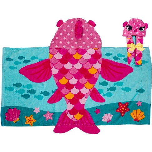Stephen Joseph 100 Percent Cotton Machine Washable Hooded Themed Soft Beach And Bath Towel With 3 Pieces And Enclosed Corners Fish Target